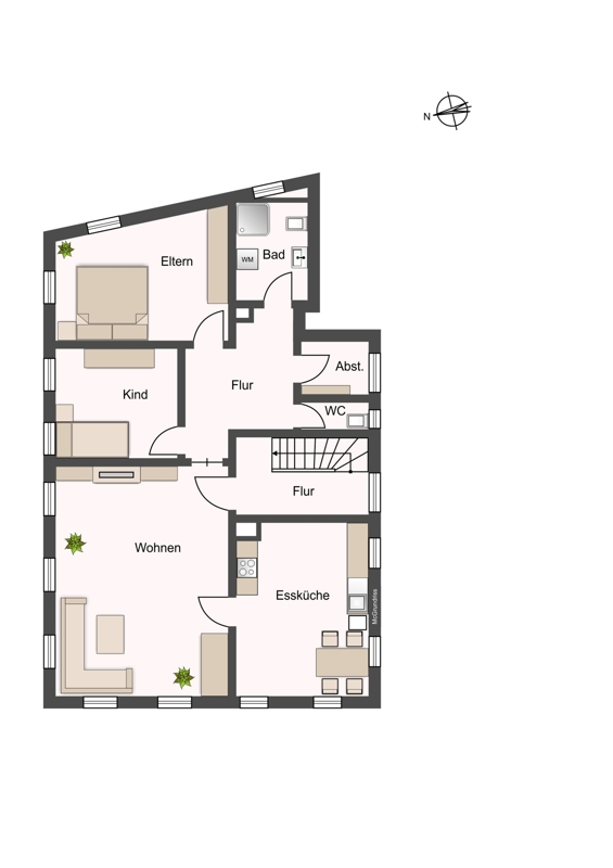 Wohnung Nr. 5 (Eingang hinten, über der Garage): 2 Zimmer, ca. 38 m² Wohnzimmer mit Kochecke, Bad m. WC, Schlafzimmer (oben)