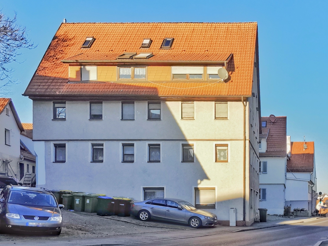 Dieses voll vermietete Objekt wurde 1938 massiv gebaut und später mehrfach renoviert und umgebaut. 1974 erfolgte der Anbau der Garage mit darüber liegender Wohnung (Eingang Gebäuderückseite).