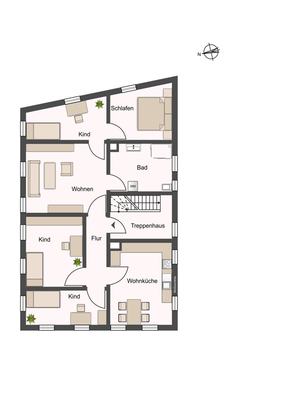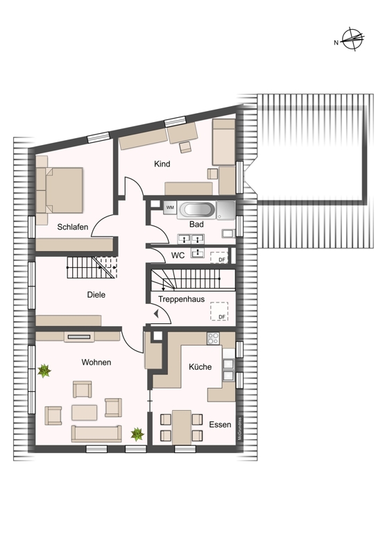 Wohnung Nr. 4 im DG (Maisonette): 5,5 Zimmer, ca. 113 m² Wohnzimmer, Schlafzimmer, Kinderzimmer Ess-Küche, Bad mit Wanne, Gäste-WC, Flur und Dachausbau (2 Kinderzimmer)
