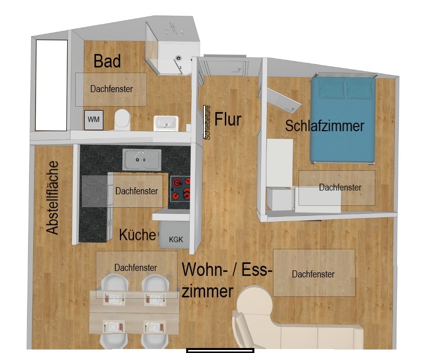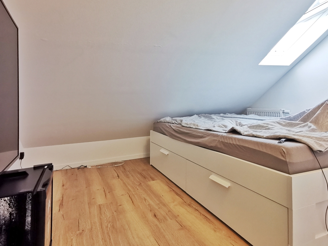 Die Wohnung besteht aus einem attraktiven Zimmer mit zwei großen Dachfenstern und einem Giebelfenster, einem Schlafzimmer, einem sehr schönen Duschbad sowie einer offenen Küche.