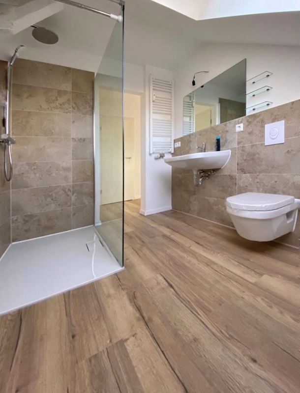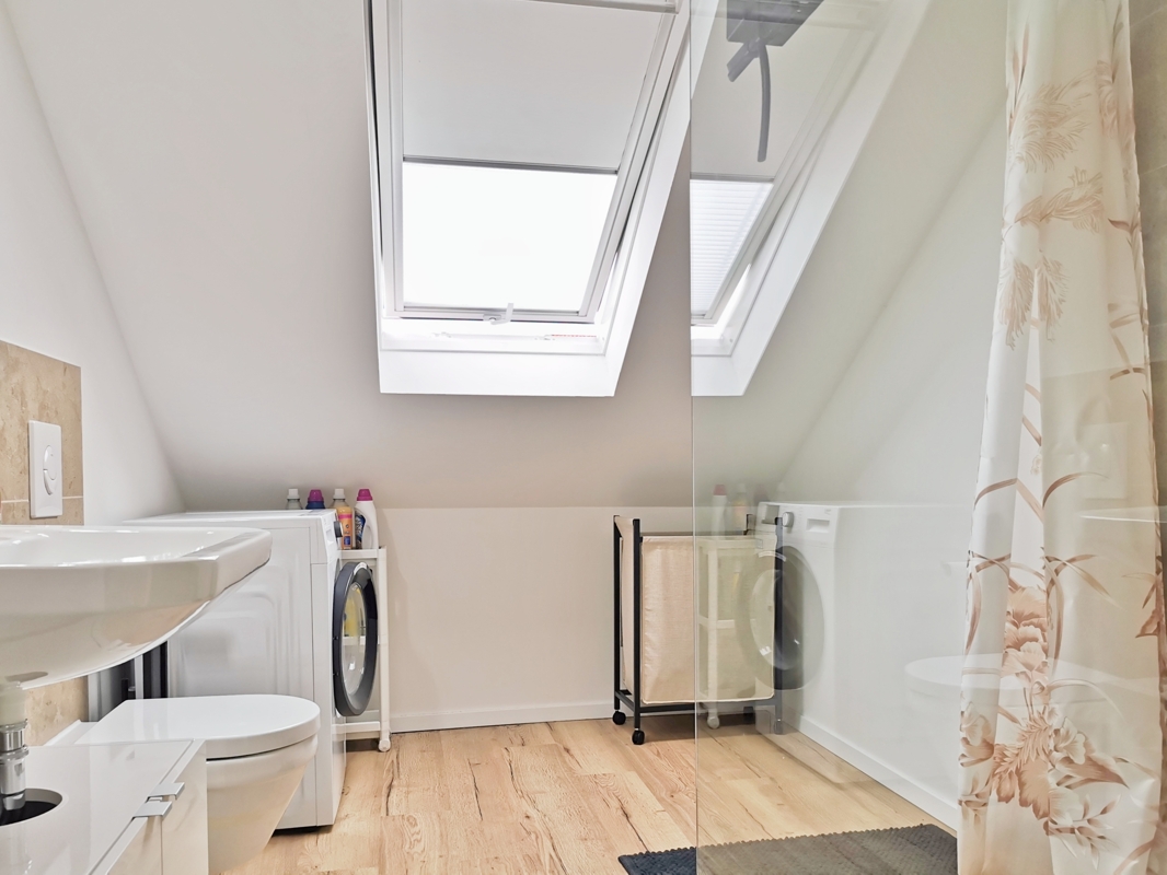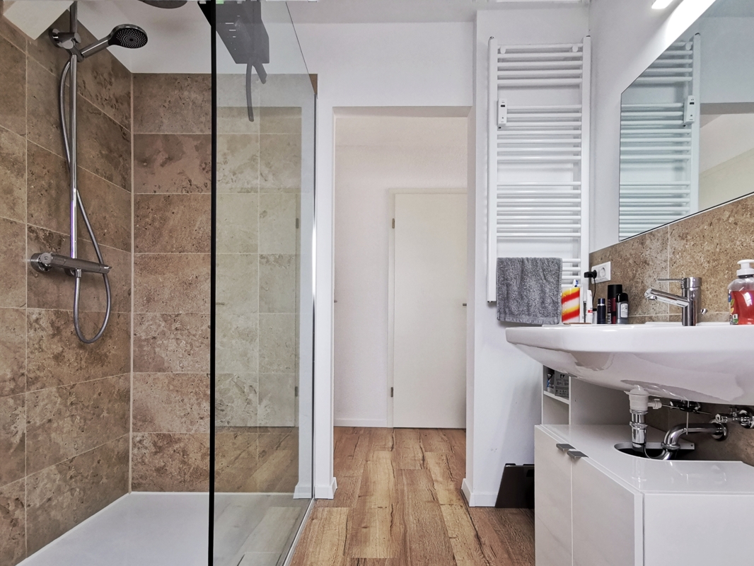 Das attraktive Bad ist mit einer großen, offenen und bodentiefen Dusche sowie einem Waschbecken und WC ausgestattet. Die Heizung erfolgt über einen Handtuchheizkörper. Eine Waschmaschine kann im Bad aufgestellt werden. Alternativ dazu gibt es in der gemeinschaftlichen Waschküche im Untergeschoss Platz sowohl für eine Waschmaschine als auch für einen Trockner.
