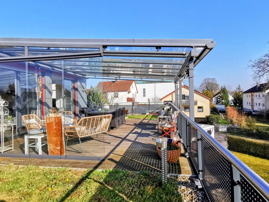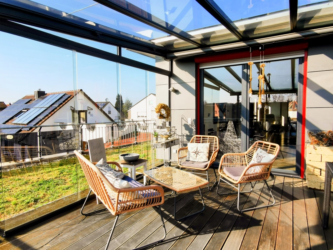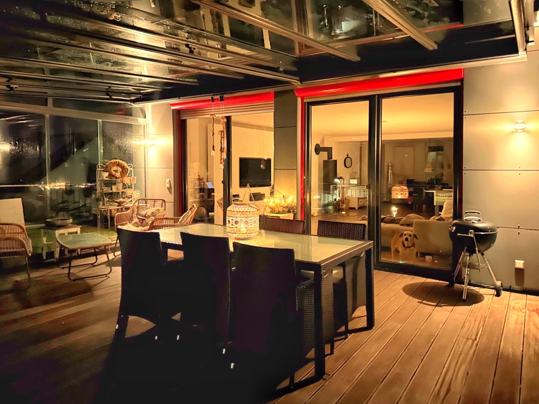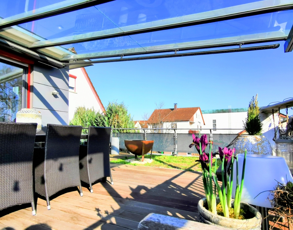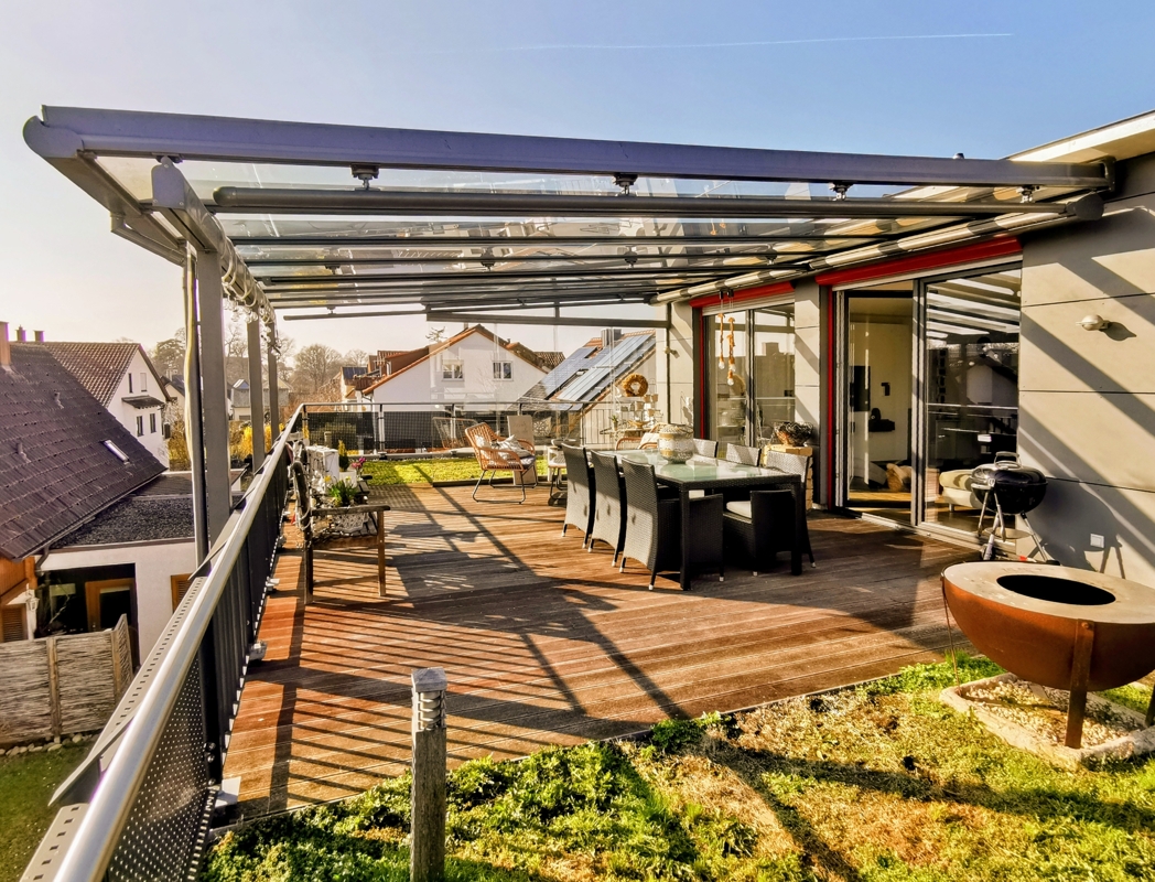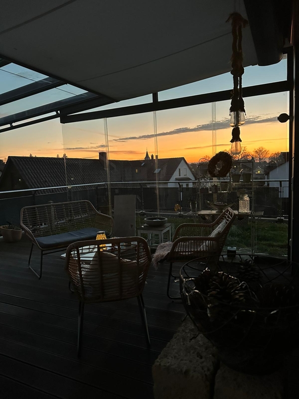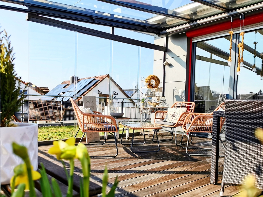 Der größte Teil der Terrasse, ca. 32 m², ist mit Glas überdacht, sodass Sie die Umgebung uneingeschränkt bewundern können. Ein zweigeteilter, elektrisch betriebener Sonnenschutz schenkt Ihnen angenehmen Schatten, während Sie den goldenen Sonnenuntergang über den Dächern der Stadt erleben. Der grüne Rasen auf einem Teil der Terrasse verleiht dem Ambiente eine erfrischende Natürlichkeit und lädt dazu ein, mit Ihren Liebsten den Abend genießen.