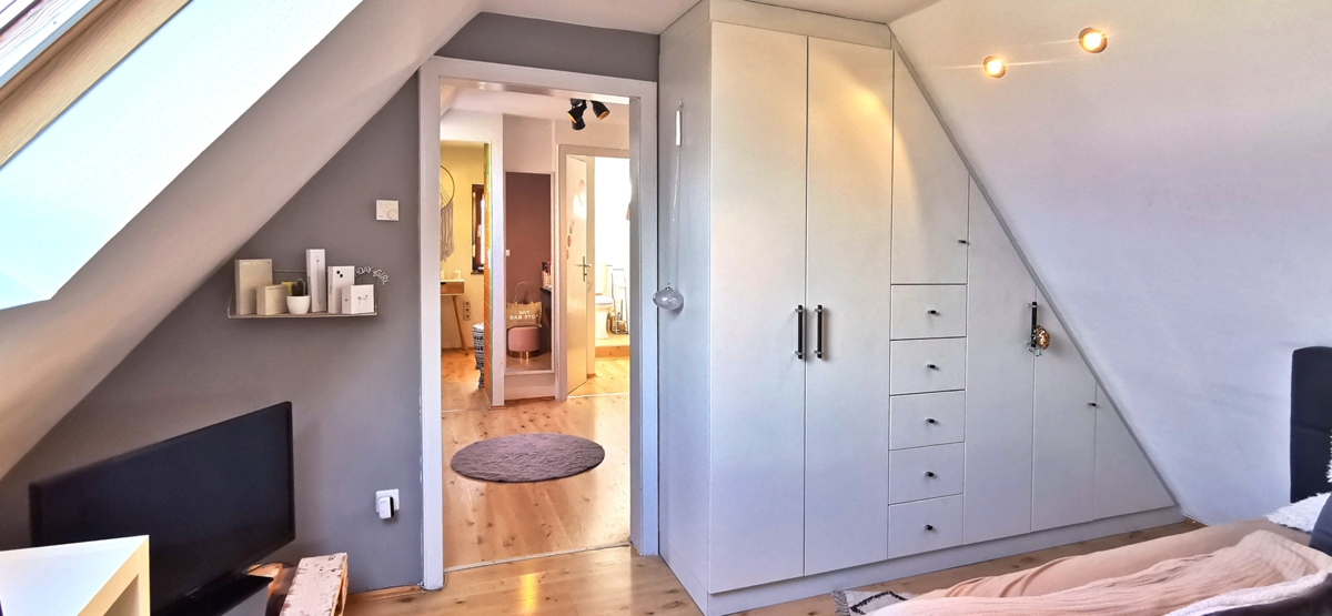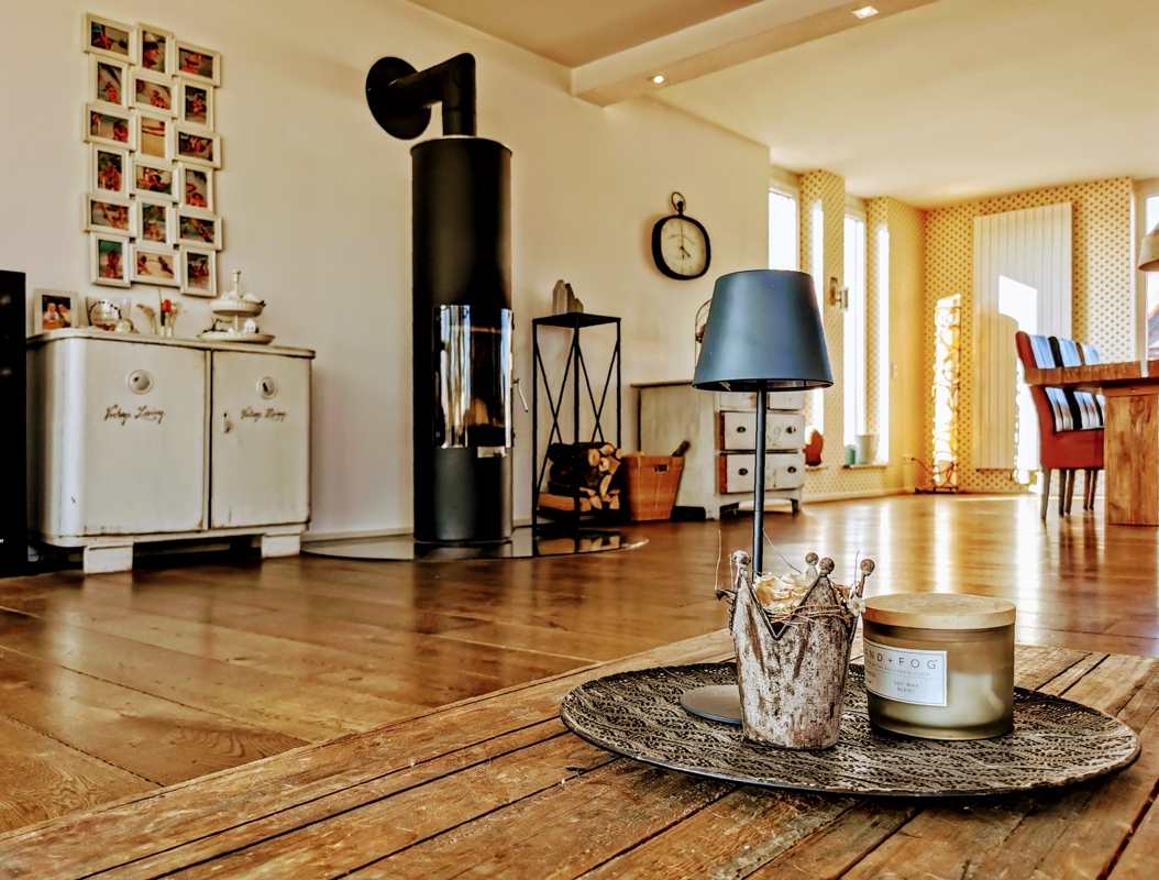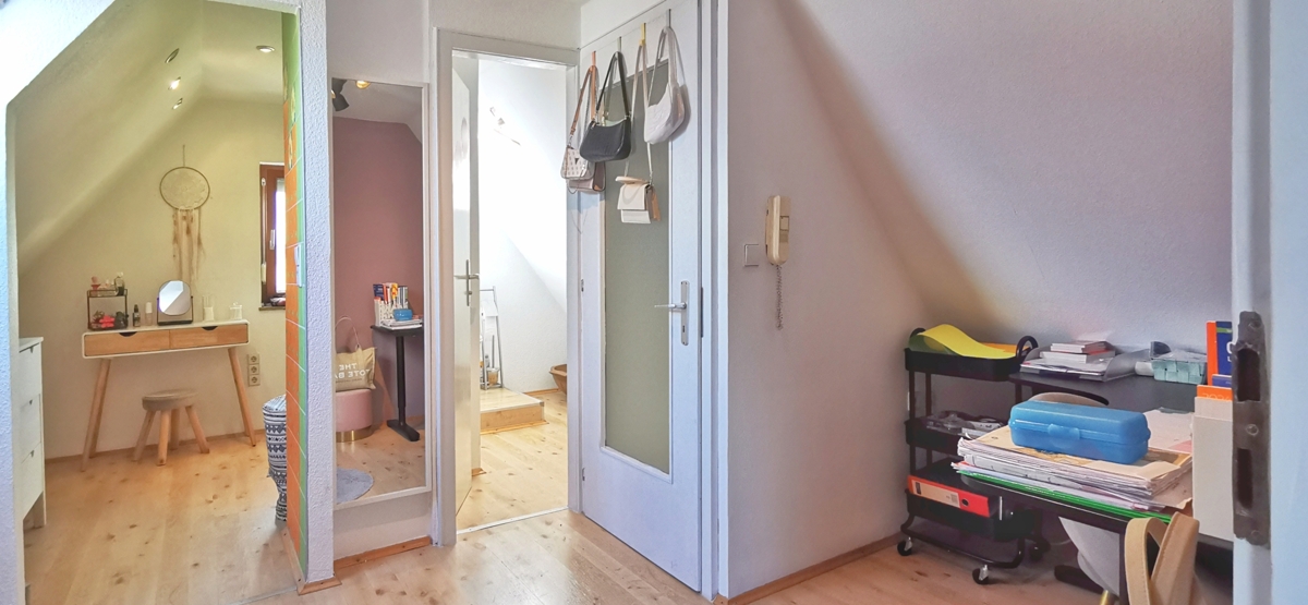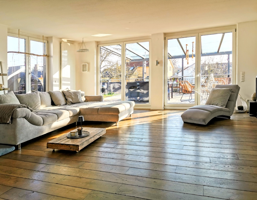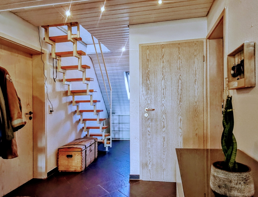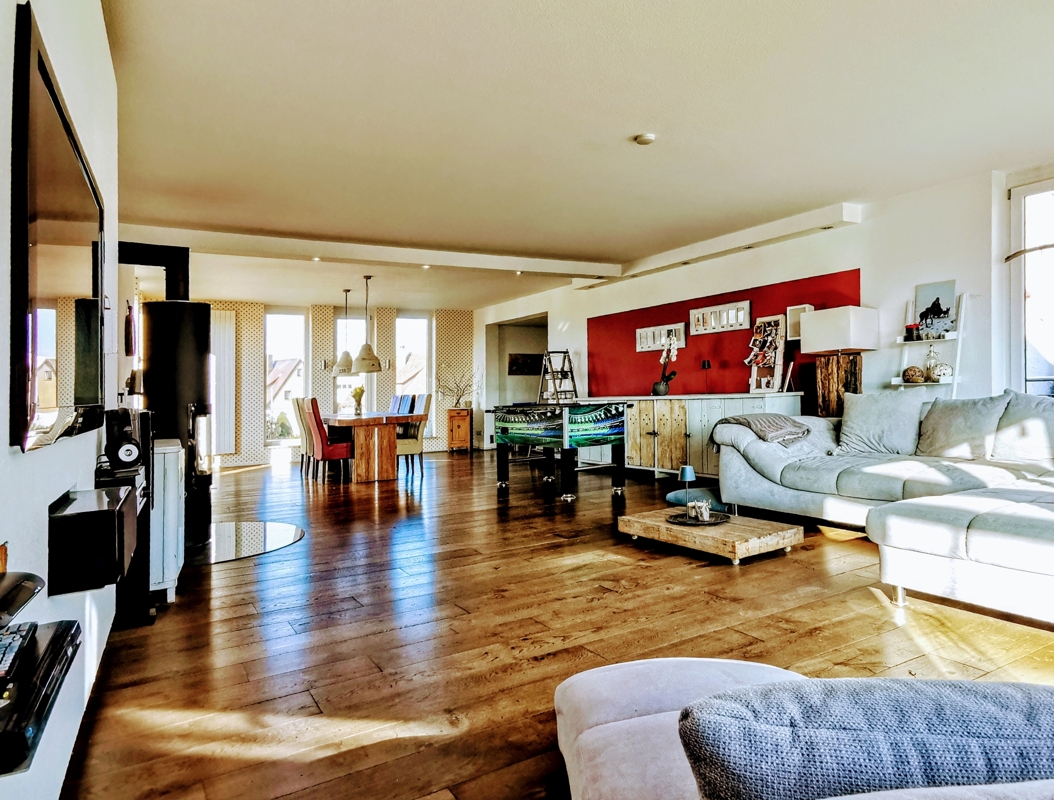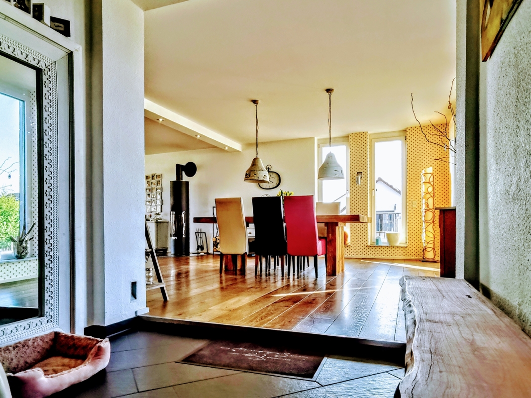 Die Bodenbeläge erzählen ihre eigene Geschichte - im ursprünglichen Einfamilienhaus begrüßen Sie warme Fliesen und gemütliches Laminat, während im Penthouse-Teil edle Eiche-Landhausdielen ein Gefühl von Eleganz und Wärme vermitteln.