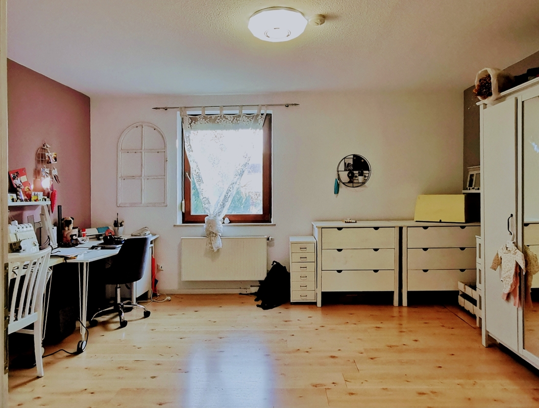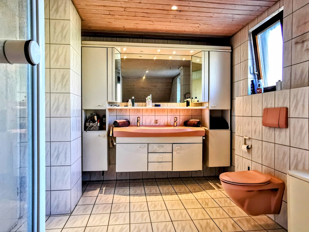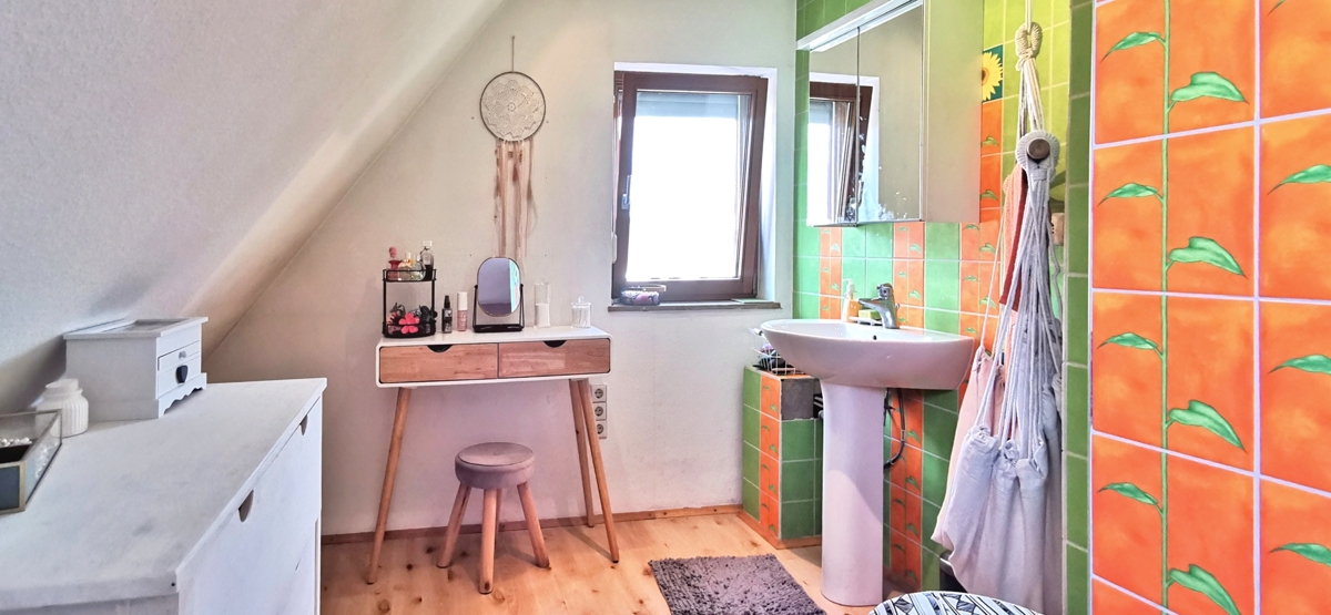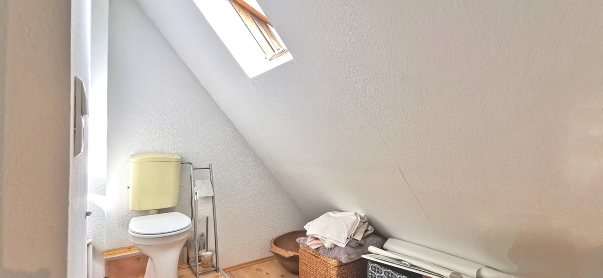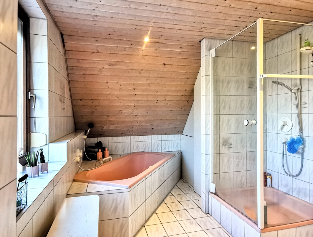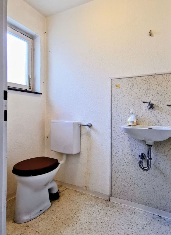 *Wohngebäude*Das Dach des im Jahr 1954 erbauten ehemaligen Einfamilienhauses wurde im Jahr 1985 neu eingedeckt. 1988 wurden die Fenster im Obergeschoss/Dachgeschoss ausgetauscht (Holz, 2-fach isolierverglast + Rollläden). Die Wohnung im Obergeschoss wurde im Jahr 1991 renoviert. Dabei wurden alle Leitungen (Strom, Wasser, Heizung) erneuert sowie das Bad saniert. Das Tageslichtbad ist mit einer Eckbadewanne, einer Dusche, einem WC und einem Doppelwaschbecken ausgestattet.