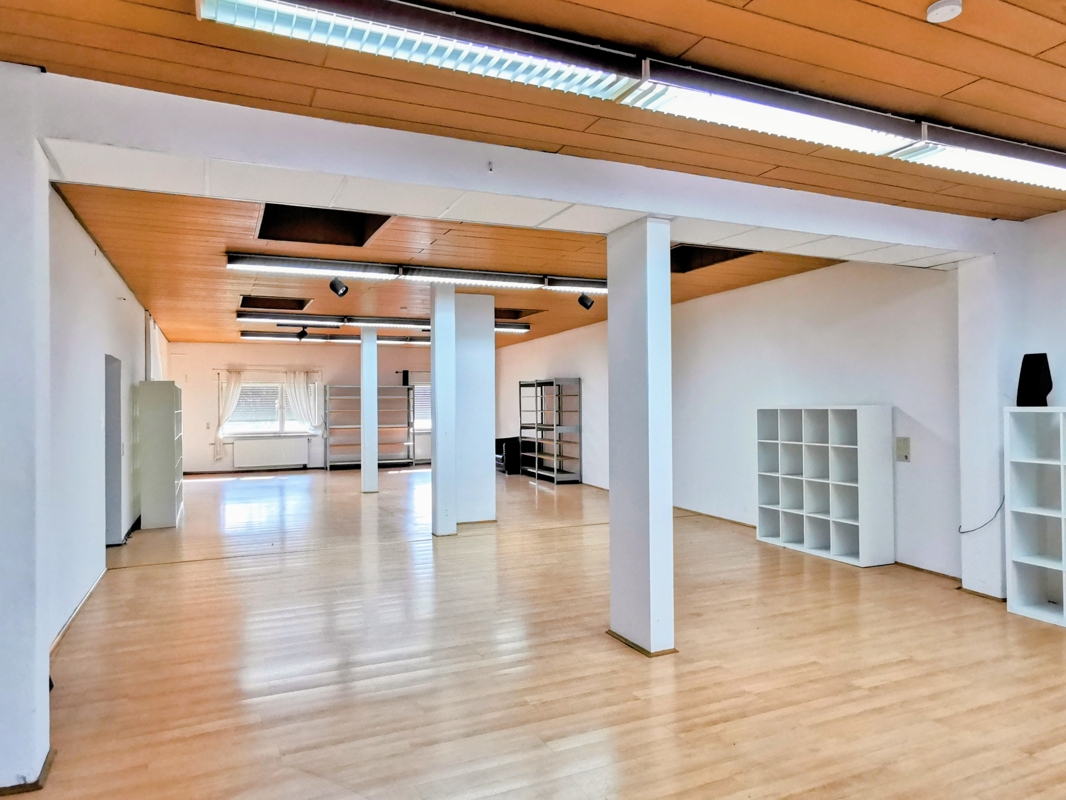 Ausstattung der Ladenfläche: Holzdecken (Eiche-Paneelen), Raufaser weiß, Fenster aus dem Jahr 1970, Laminat-Fußboden