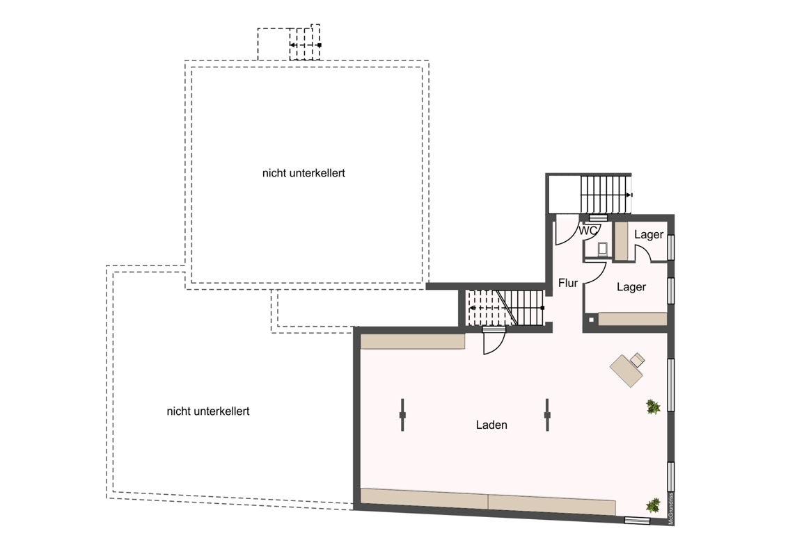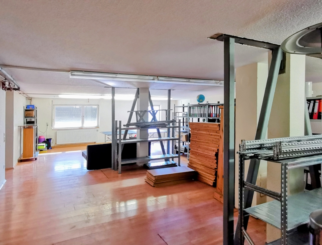 Der Gewerbeteil der Immobilie ist größtenteils leerstehend und kann kurzfristig genutzt werden. Für das Untergeschoss liegt eine genehmigte Planung als Wohnung mit eigenem Zugang vor, die mit überschaubarem Aufwand wieder umgesetzt werden könnte. Ebenso wäre es möglich, im hinteren Bereich der Ladenfläche im Erdgeschoss eine Wohnung zu realisieren.