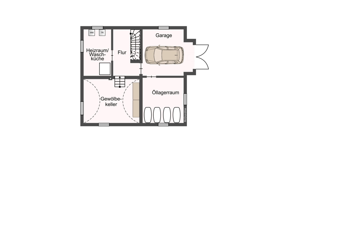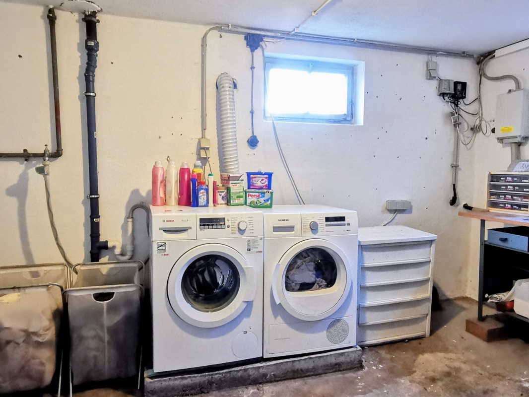 Zur Wohnung gehört die Garage im Untergeschoss sowie gemeinsame Nutzflächen (Gewölbekeller, Heizraum/Waschküche, Heizöllagerraum) mit insgesamt ca. 70 m².