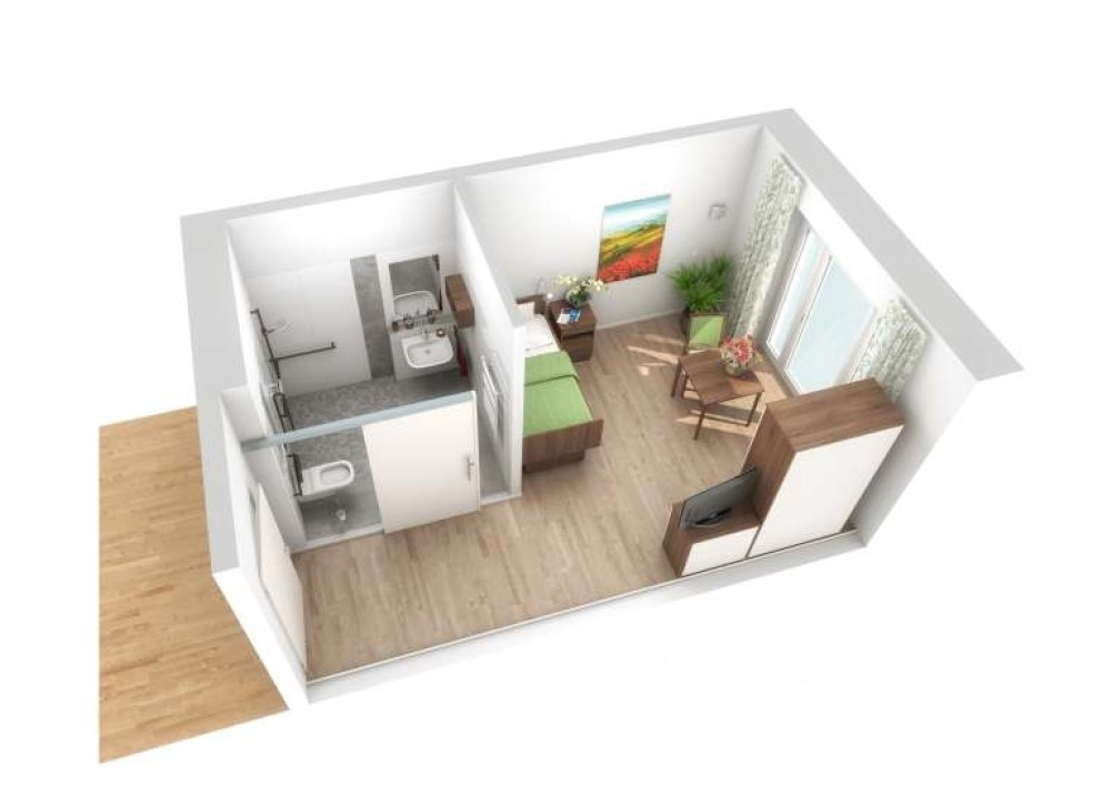 Alle Bewohnerzimmer verfügen über ein eigenes Badezimmer mit Dusche, WC und Waschtisch Jeder Wohngruppe ist ein Gemeinschaftsraum mit Wohnküche zugeordnet.Die Gemeinschaftsräume verfügen jeweils über einen Balkon bzw. eine Terrasse.
