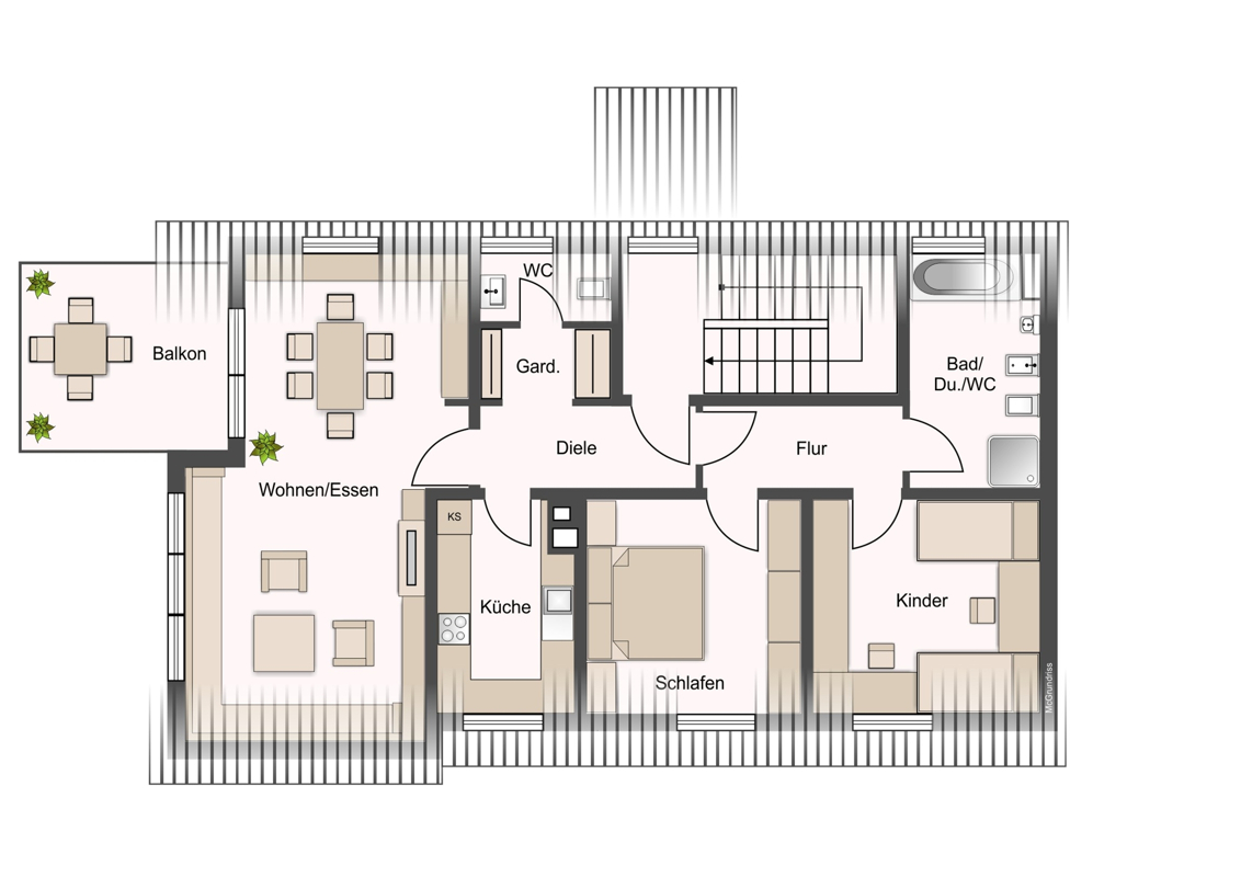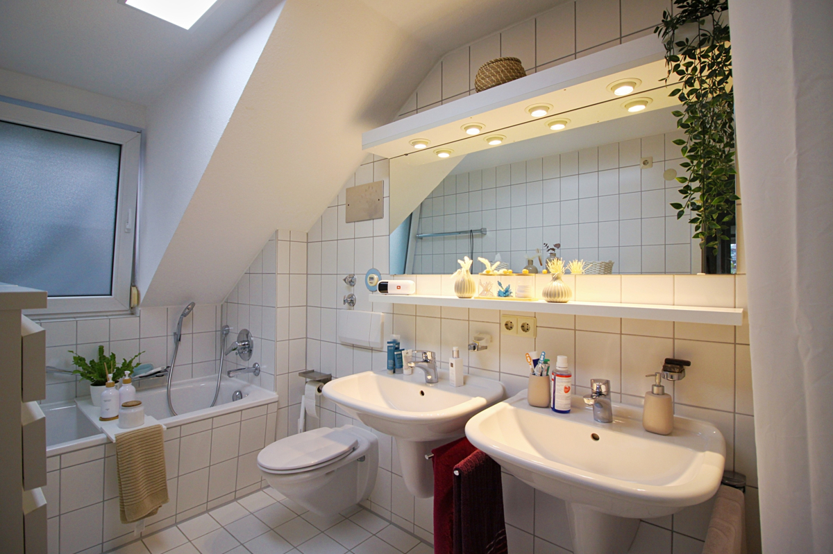 - Badezimmer: Wanne, Dusche, WC und zwei Waschbecken- Gäste-WC: Ja