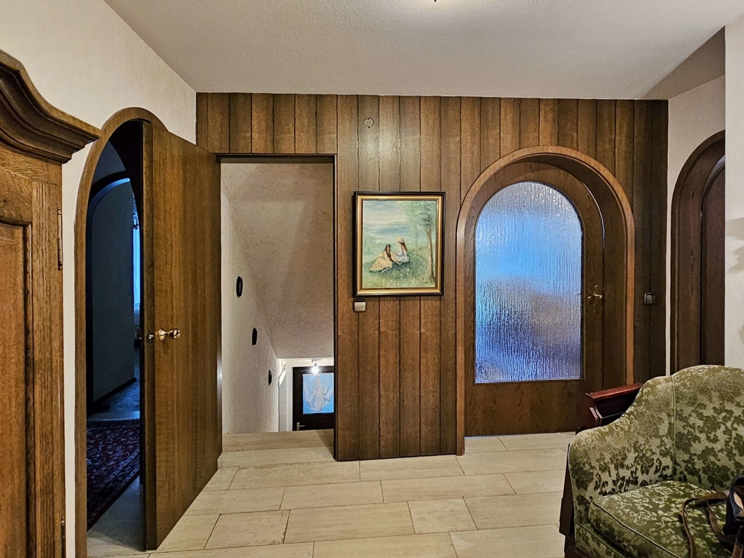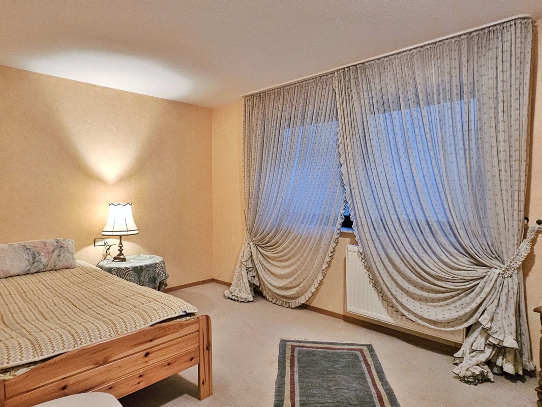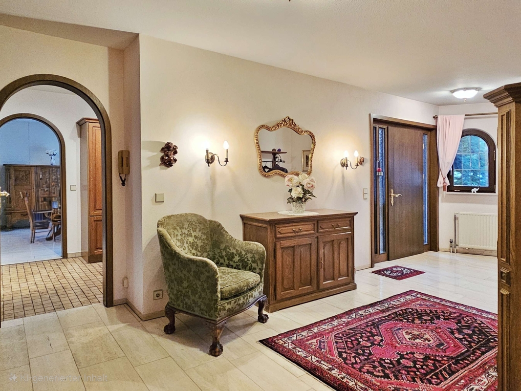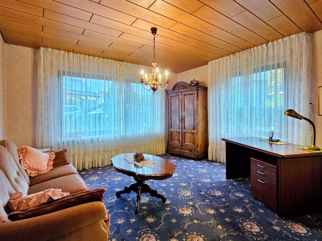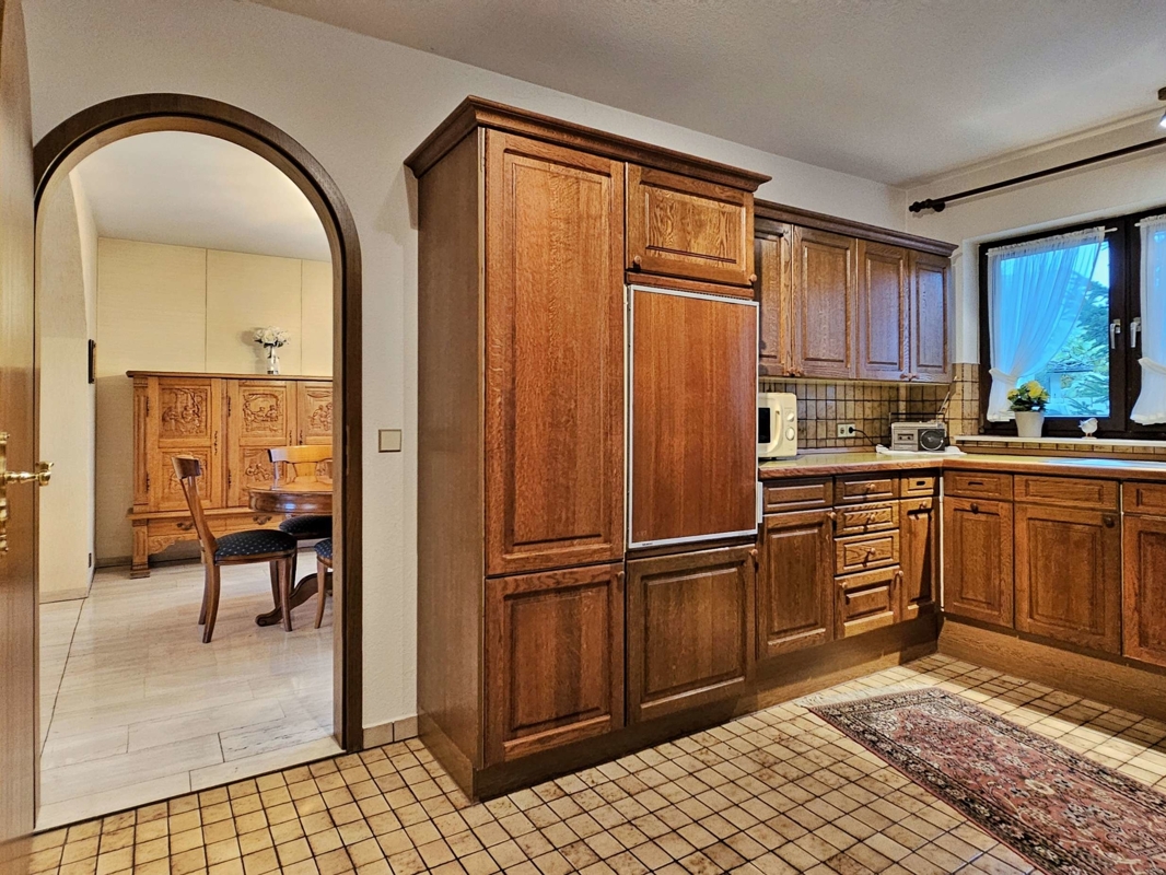 Küche und Bodenbeläge: Die Einbauküche im altdeutschen Stil aus dem Jahr 1981 ist Bestandteil des Verkaufs. Hochwertige Bodenbeläge prägen das Erdgeschoss: hellbeige Marmor-Fliesen im Wohn-/Esszimmer, Diele, Gäste-WC und Flur; Teppichboden im Schlafzimmer und in den Kinderzimmern sowie Fliesen in der Küche. Im Untergeschoss ist das Gästezimmer mit Teppich ausgestattet, die restlichen Räume sind gefliest.