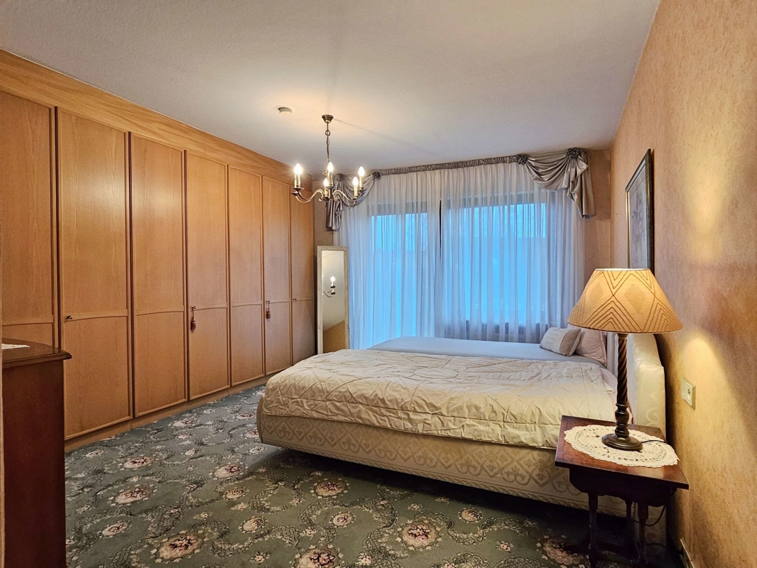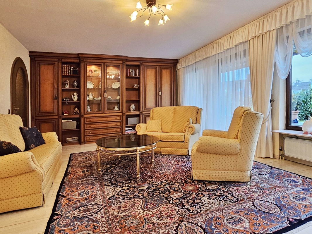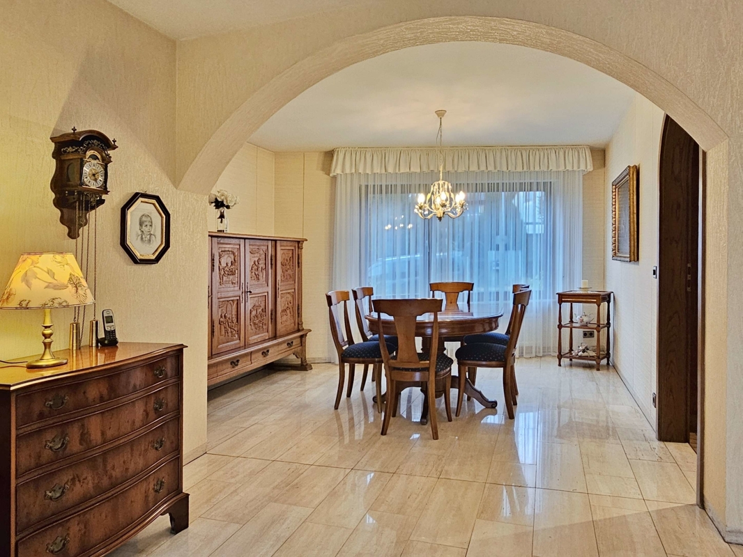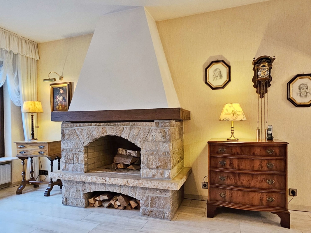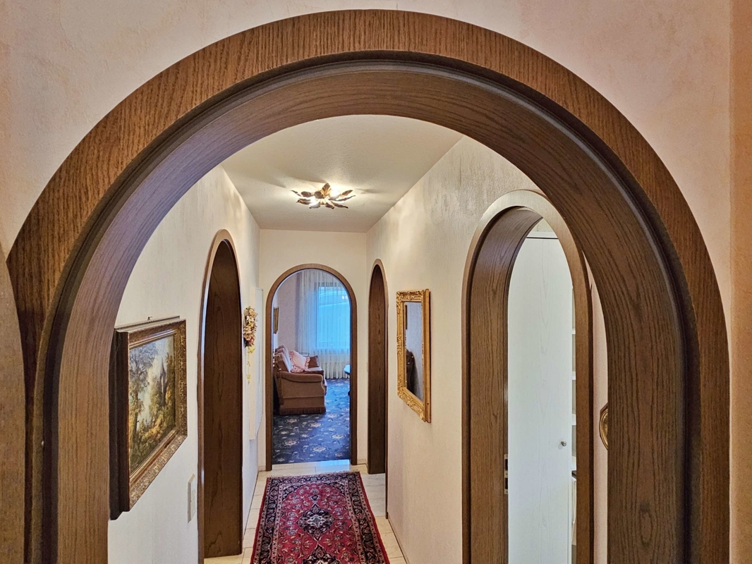 Küche und Bodenbeläge: Die Einbauküche im altdeutschen Stil aus dem Jahr 1981 ist Bestandteil des Verkaufs. Hochwertige Bodenbeläge prägen das Erdgeschoss: hellbeige Marmor-Fliesen im Wohn-/Esszimmer, Diele, Gäste-WC und Flur; Teppichboden im Schlafzimmer und in den Kinderzimmern sowie Fliesen in der Küche. Im Untergeschoss ist das Gästezimmer mit Teppich ausgestattet, die restlichen Räume sind gefliest.