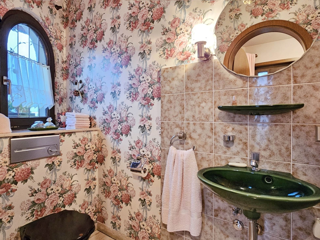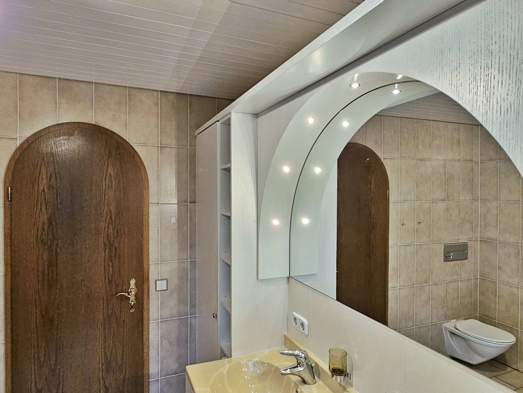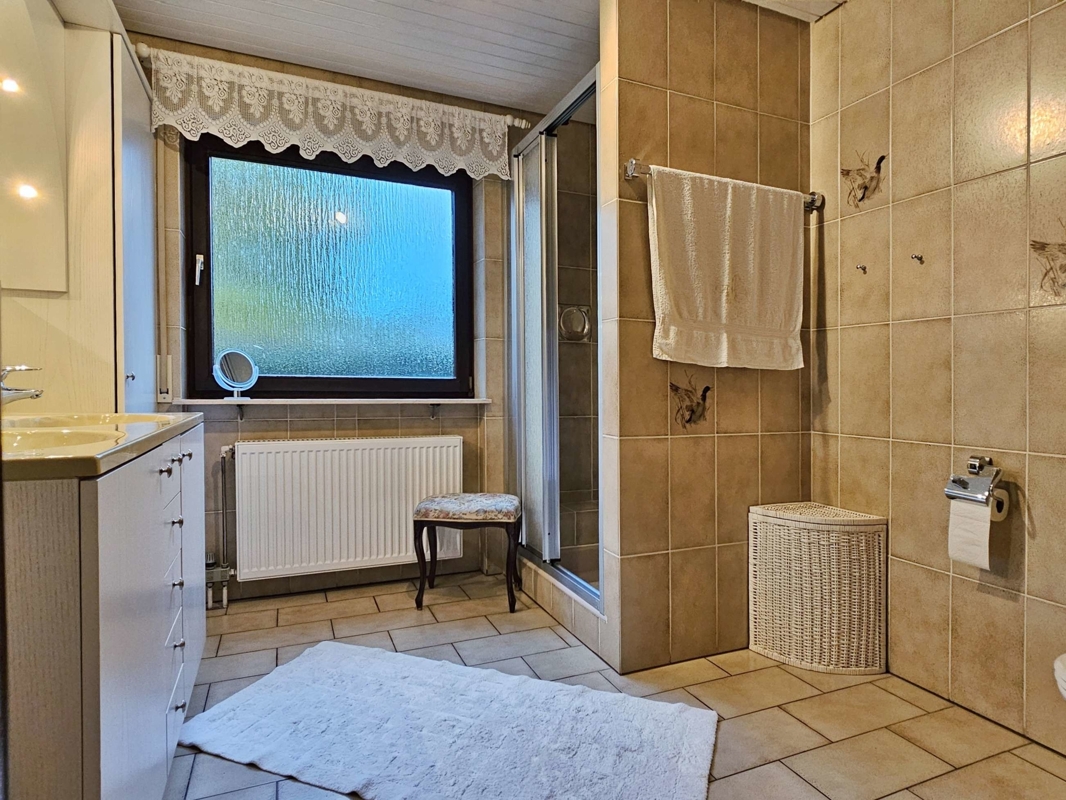 Sanitäre Ausstattung: Im Erdgeschoss befindet sich ein Tageslichtbad mit Doppelwaschbecken, Dusche und wandhängendem WC. Ein weiteres Bad im Untergeschoss verfügt über eine Badewanne, Waschbecken und wandhängendes WC, ebenfalls in sehr gepflegtem Zustand.