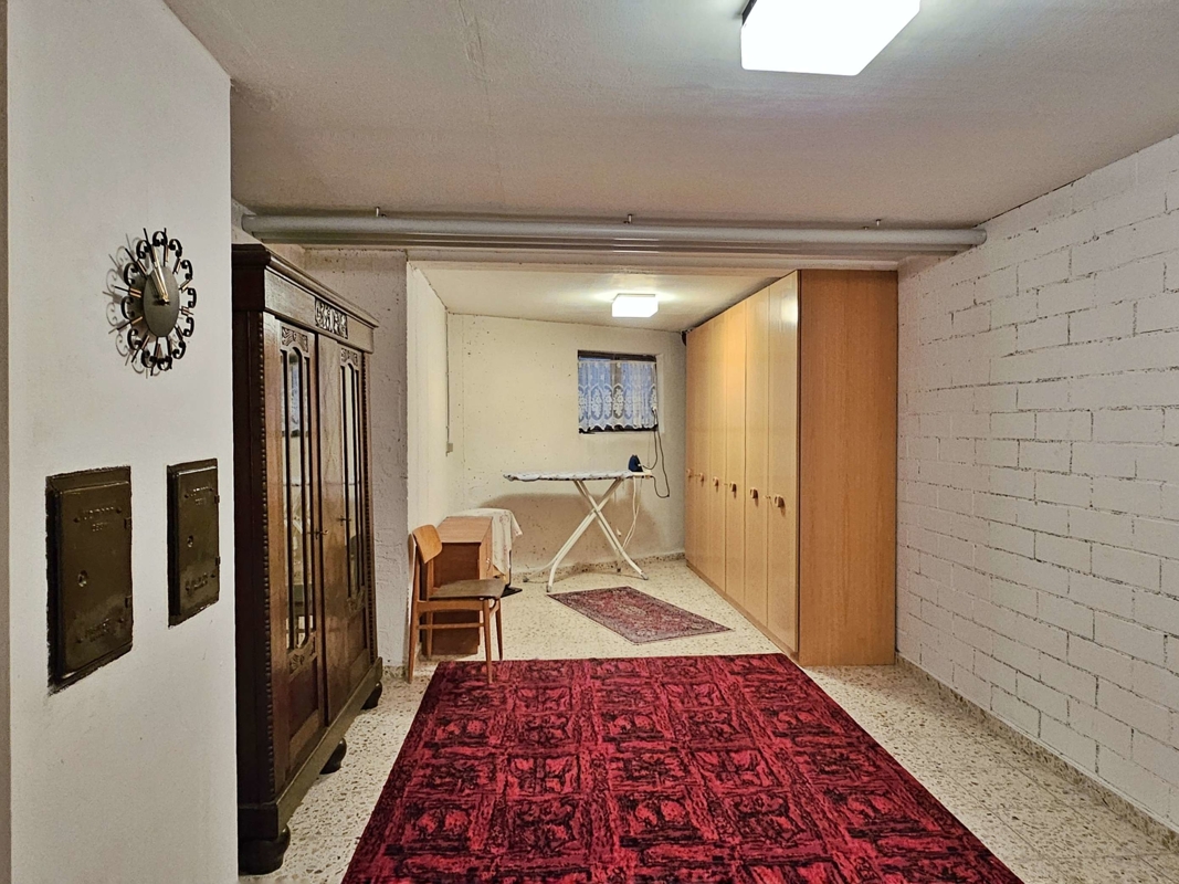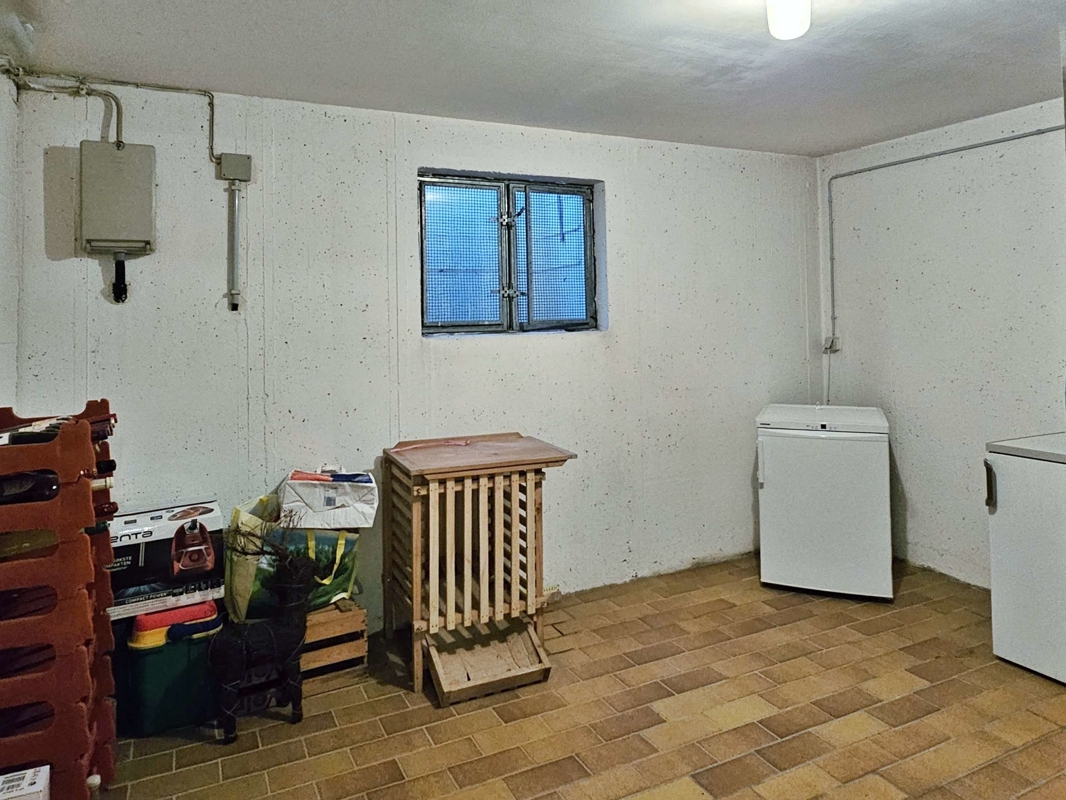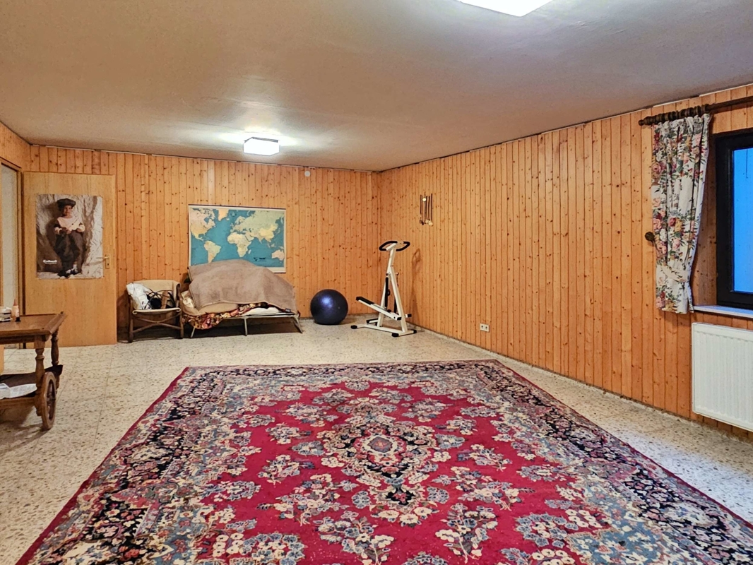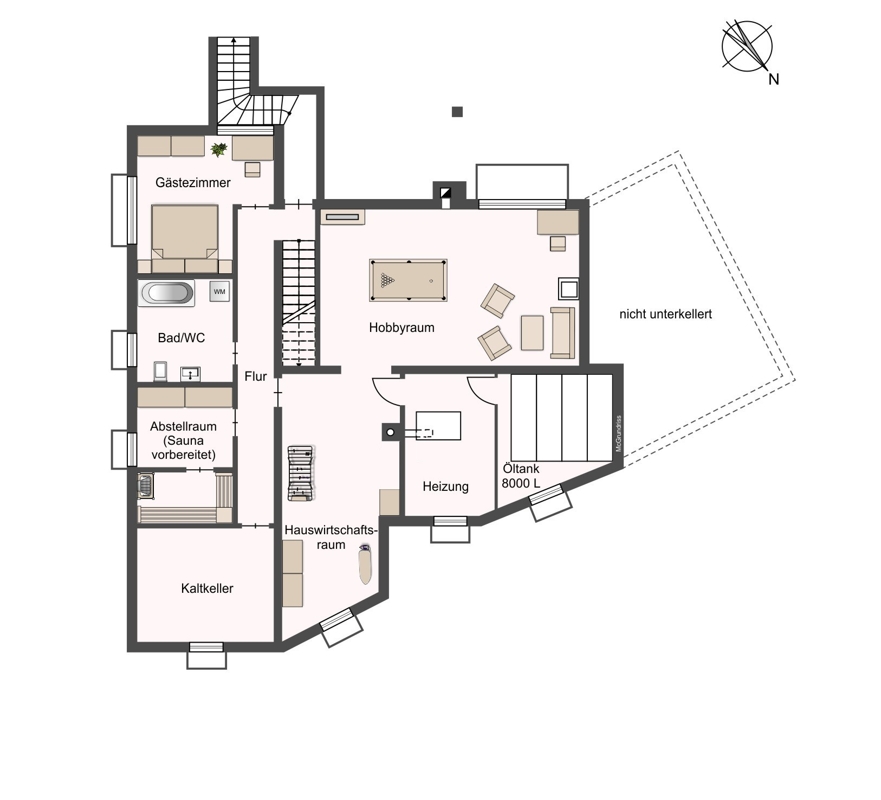 Untergeschoss (ca. 52 m²): Ein Gästezimmer, ein Bad mit Badewanne und WC, ein beheizbarer Hobbyraum (ca. 33 m²) wurden nachträglich zu Wohnraum ausgebaut, wozu kein genehmigtes Baugesuch vorliegt. Zusätzlich gibt es hier folgende Nutzflächen: ein großer Hauswirtschaftsraum, ein Abstellraum mit Anschluss für eine Sauna sowie Kaltkeller, Heizraum und Öllagerraum.