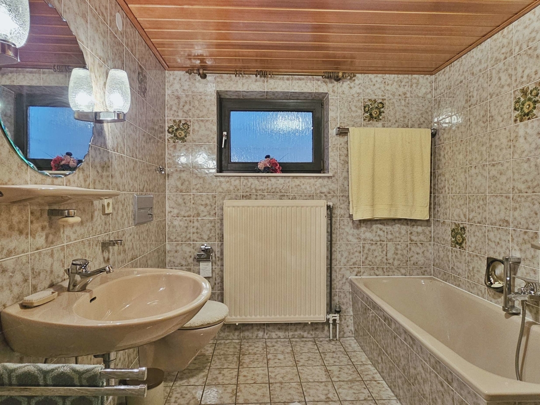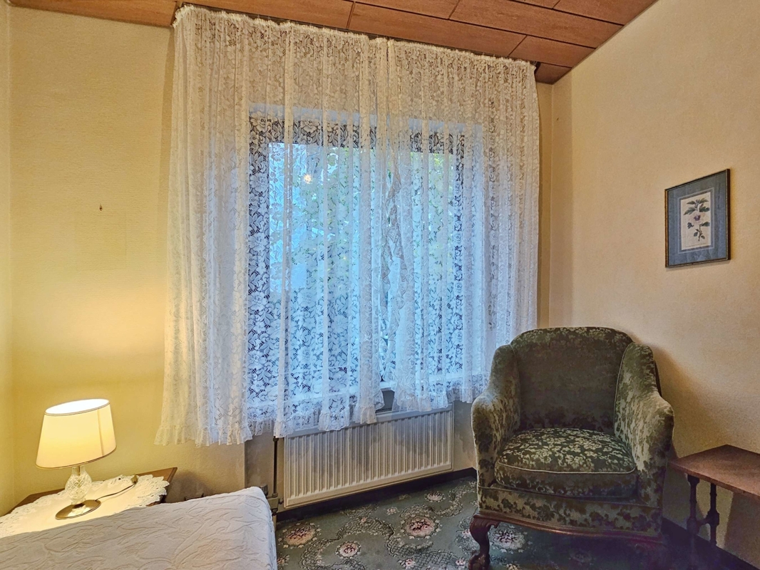 Türen, Wände, Decken und Fenster: Das Haus ist mit massiven, dunkelbraunen Eichenholztüren ausgestattet. Die Fenster stammen aus dem Baujahr und sind in dunkelbraunem Holz ausgeführt, zweifach isolierverglast. Die Wände sind verputzt und tapeziert. Die Decken sind weiß, ausgenommen die beiden Kinderzimmer haben Holzdecken.