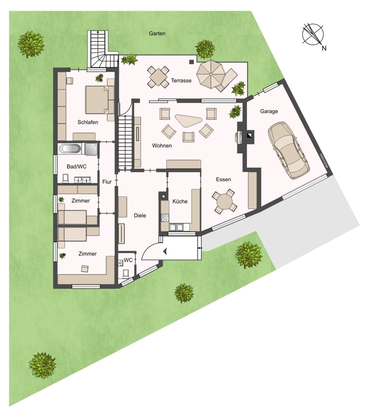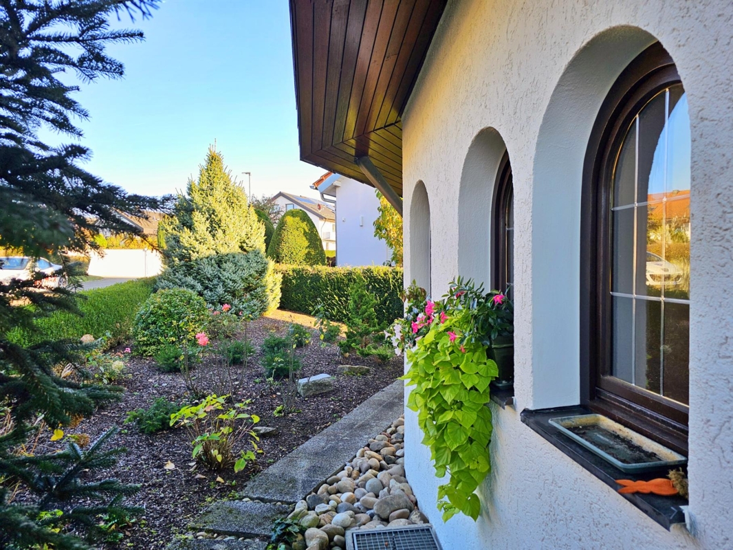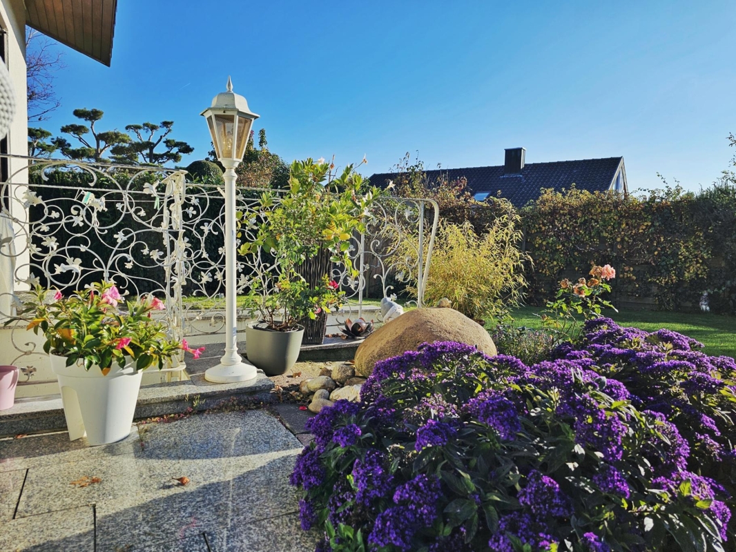 Außenbereich: Der idyllische, gepflegte und nach Süden ausgerichtete Garten bietet viel Privatsphäre und hat einen direkten Zugang zur Garage.